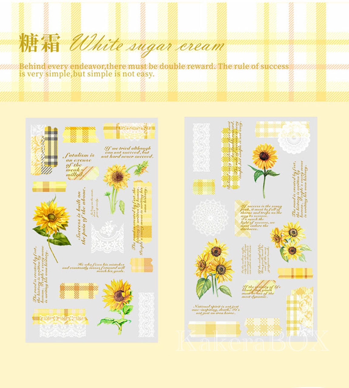 お洒落な英字とチェック、繊細なレースのデザインとヒマワリの色使いがとても素敵なセルフカットタイプの海外シールです。