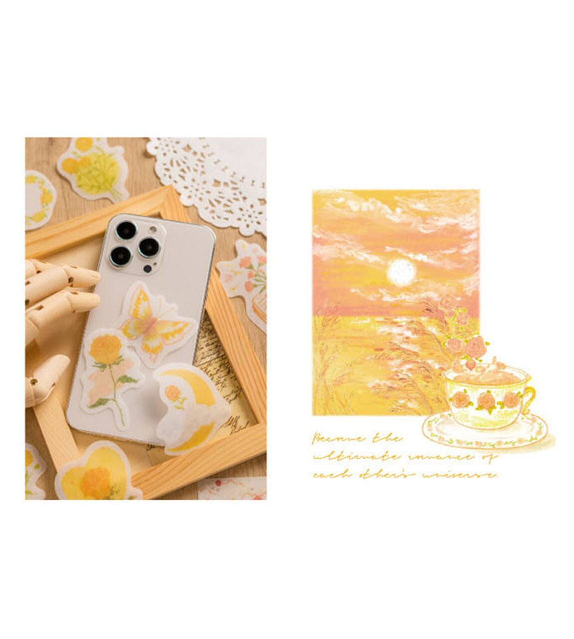 英字が使われたアンティーク風素材紙と夕陽やお花などのイエロー系海外シールのセットです。