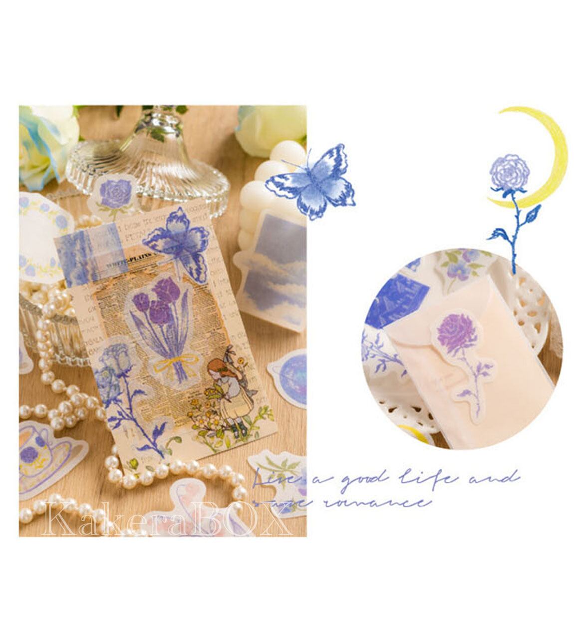 英字が使われたアンティーク風素材紙と空やお花などの青色系シールのセットです。