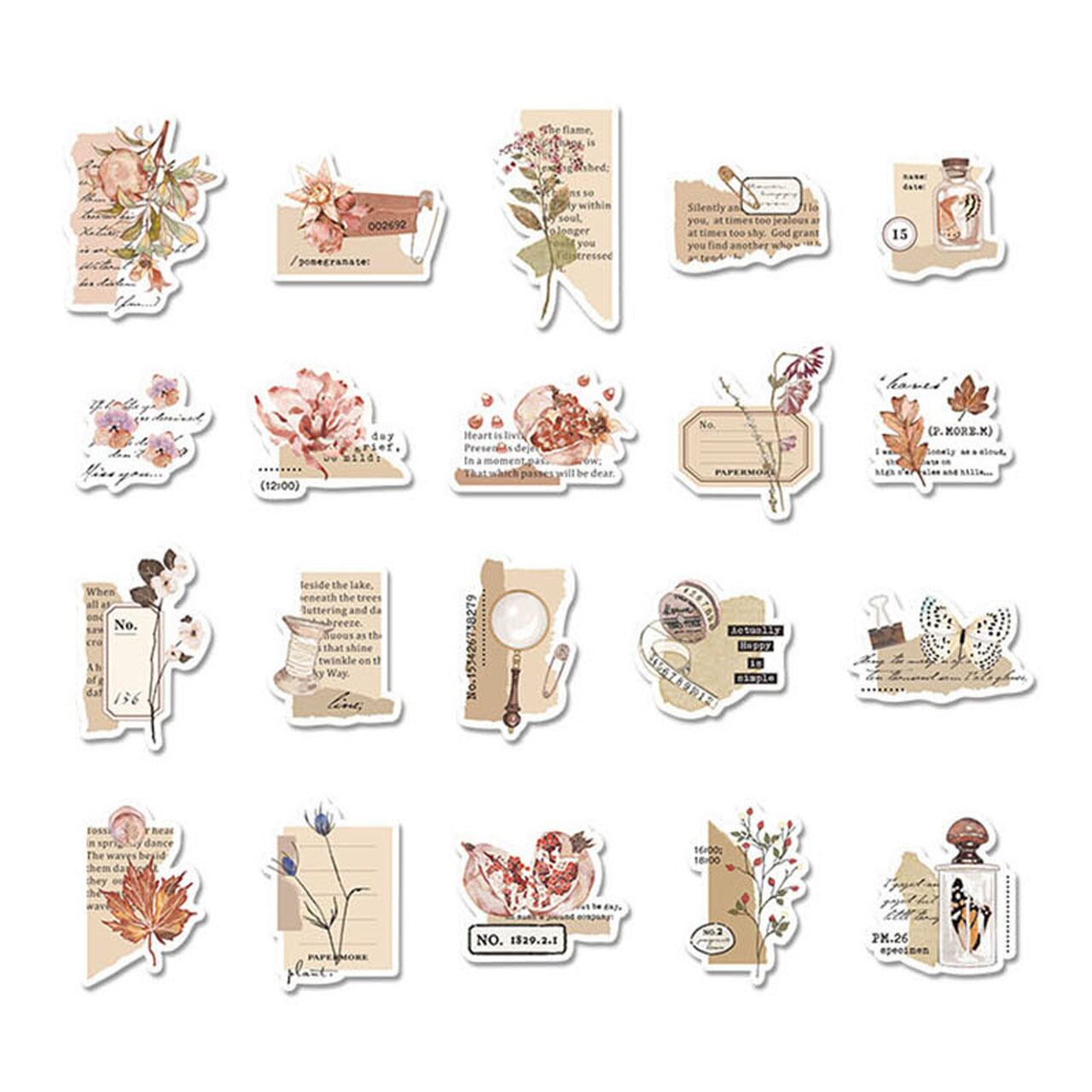 ざくろやお花などが英字と組み合わさって1枚でもお洒落なコラージュデザインのフレークシールです。